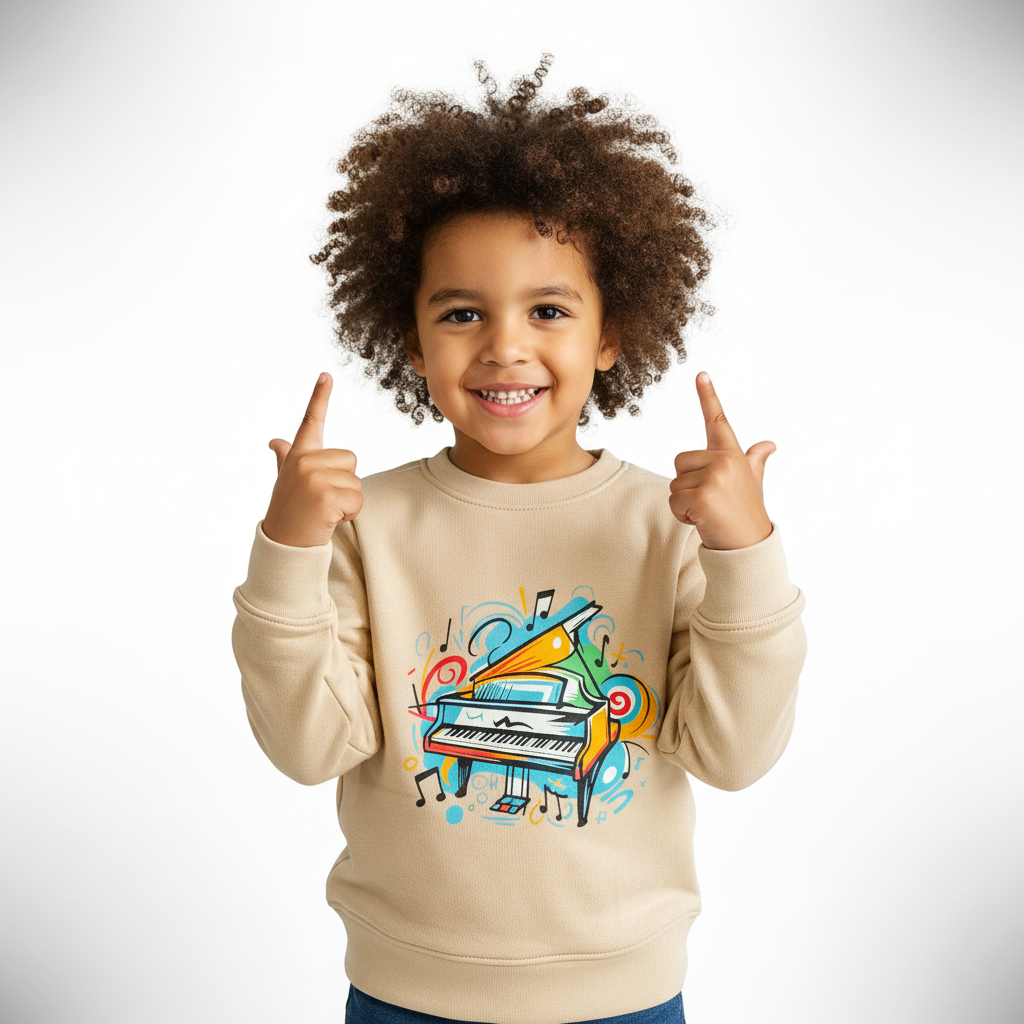 Let your little one express their love for music with this stylish Kids Beige Piano Art Sweatshirt. Made from soft, breathable cotton blend fabric, it offers all-day comfort and warmth. The front features a vibrant, artistic piano graphic surrounded by colorful musical notes — perfect for young music lovers and creative minds. With its cozy fit, ribbed cuffs, and durable stitching, this sweatshirt is ideal for everyday wear, school, or casual outings.
