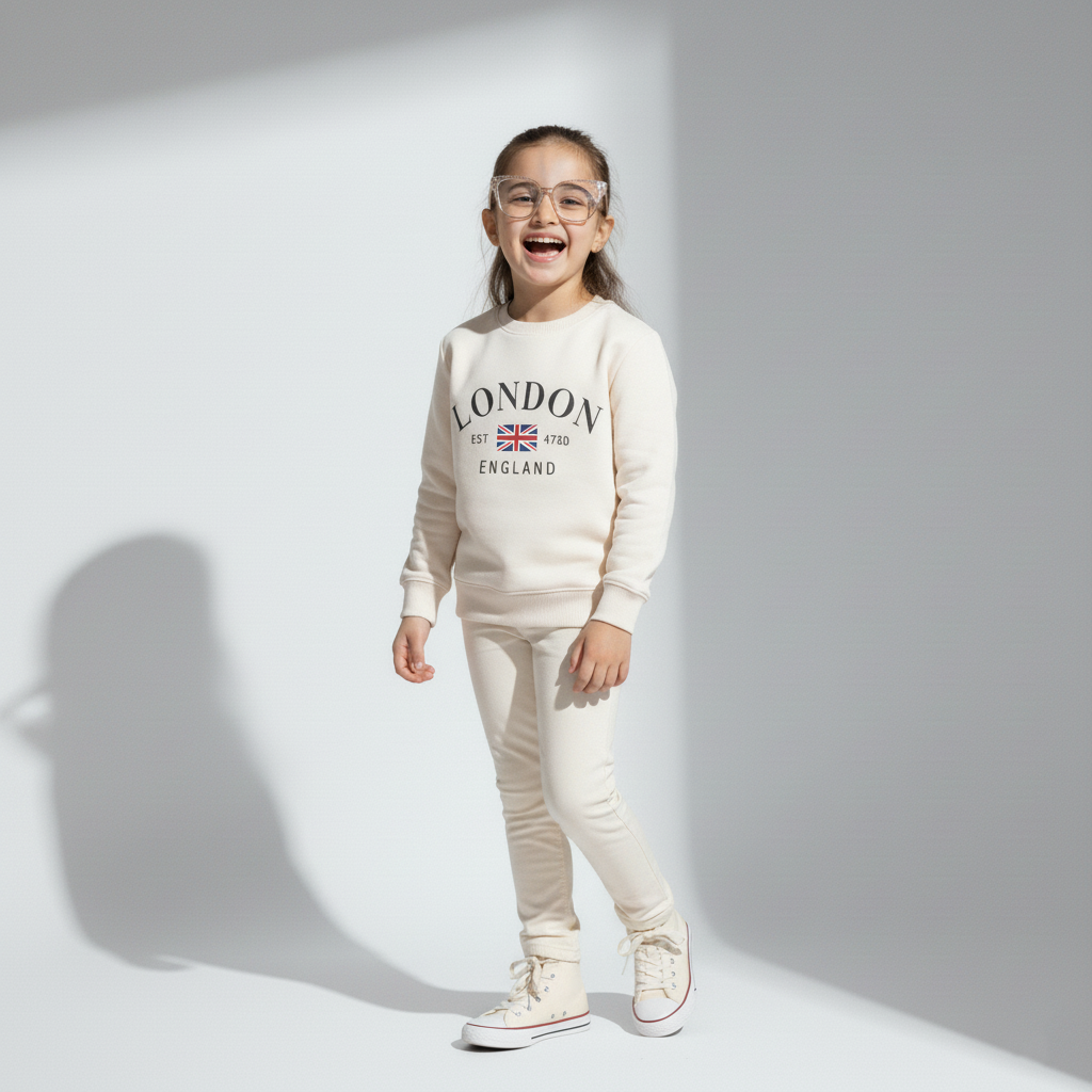 Bring timeless British charm to your little one’s wardrobe with this Girls Off White “London England” Sweatshirt. Perfect for cozy days and cool evenings, this sweatshirt combines comfort, simplicity, and elegance in one stylish piece. Made from a Premium Fleece fabric, it keeps your child warm while allowing easy movement for playtime or casual outings.