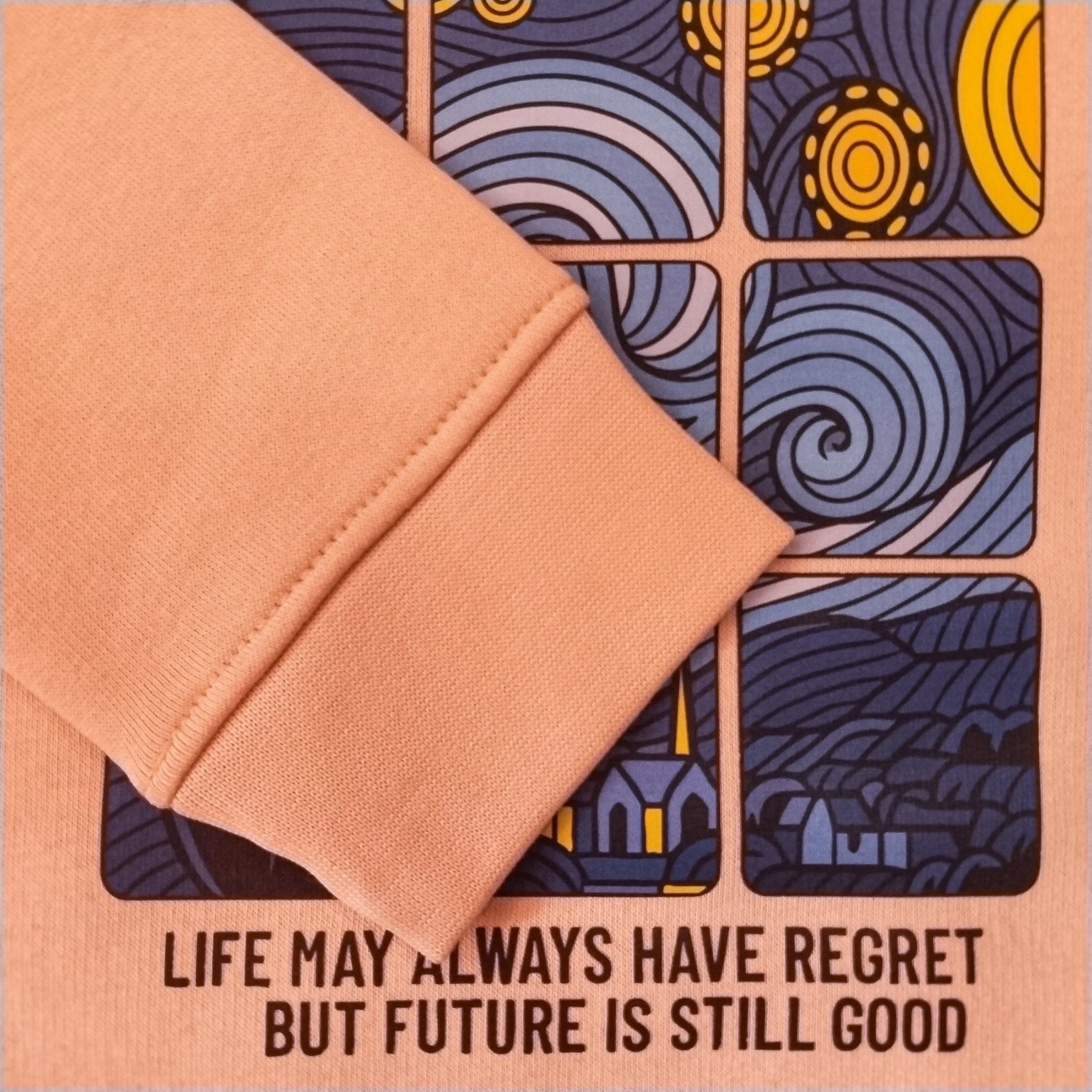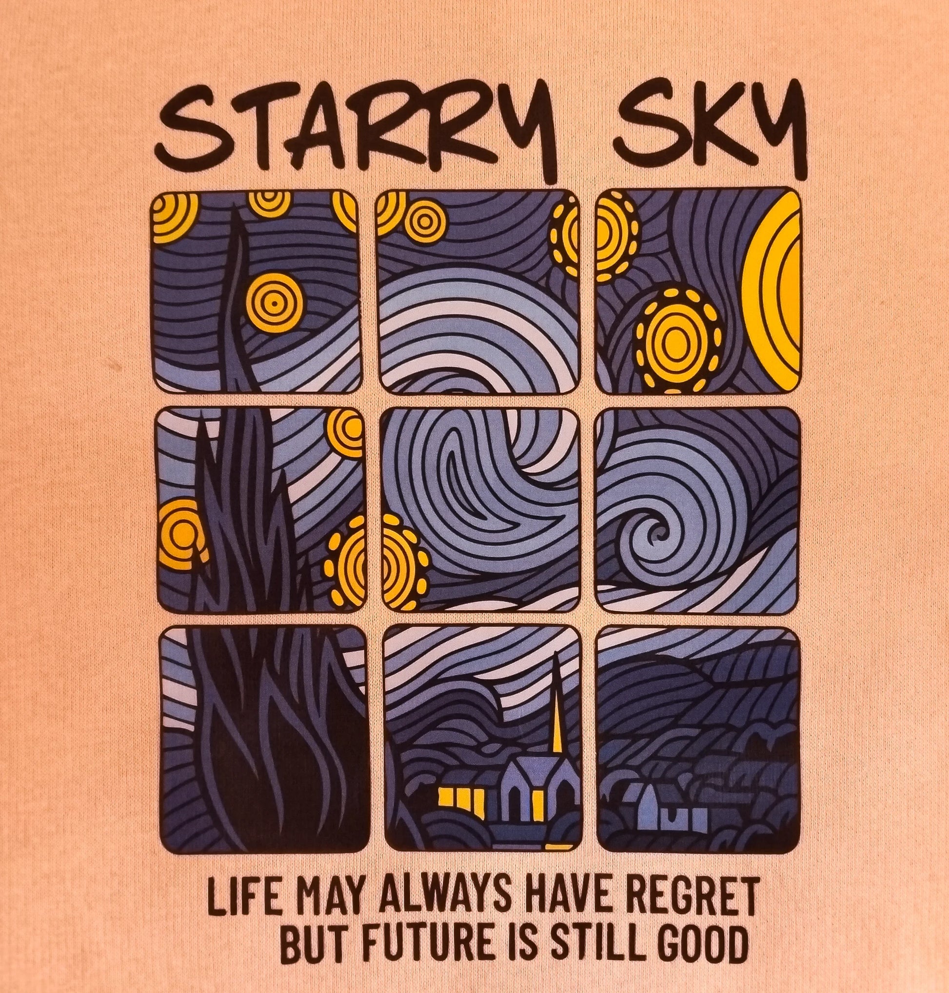 A super comfy and cool graphic sweatshirt that inspires! It features the text "STARRY SKY" and an encouraging quote next to a modern art print. The soft peach color and plush interior make this an instant favorite for warmth and style.