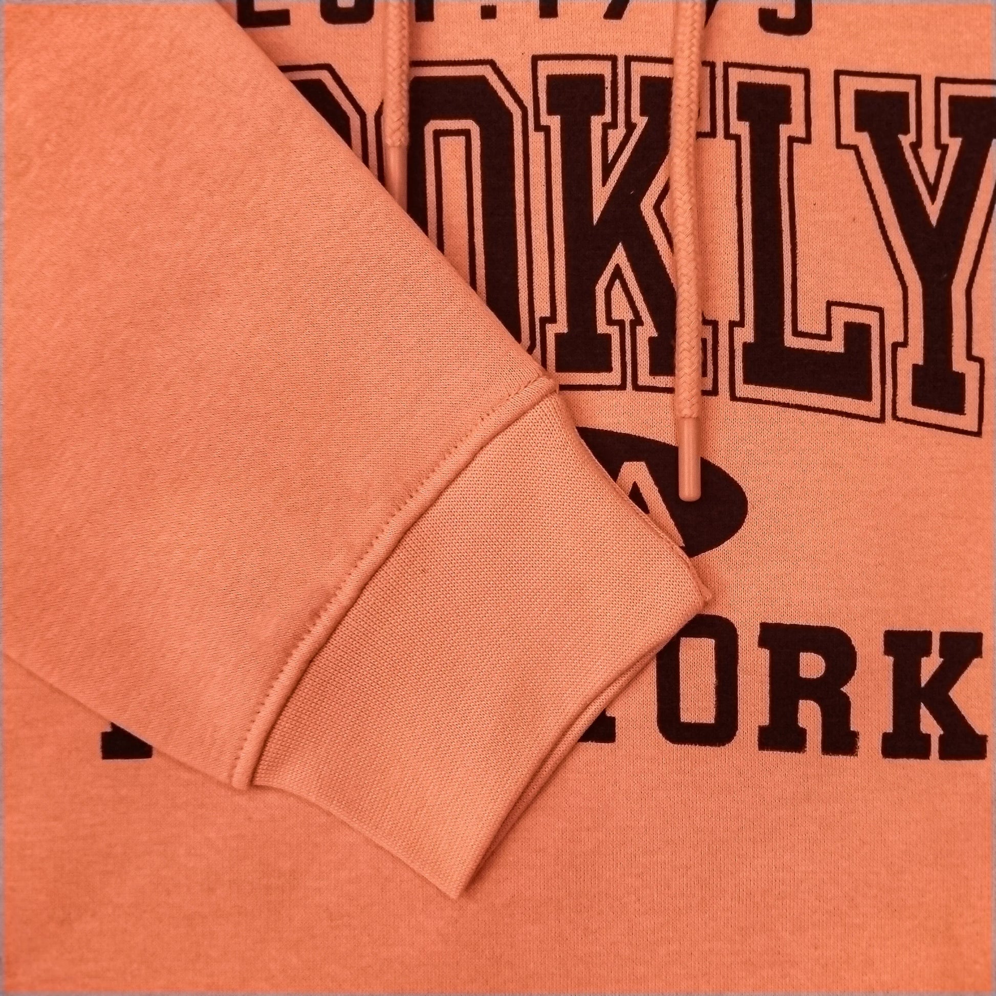 Embrace the iconic style of New York with this comfortable and eye-catching hoodie. The vibrant orange/coral color provides a fresh backdrop for the bold, retro-inspired "BROOKLYN" graphic. It features a drawstring hood, long sleeves with ribbed cuffs, and a soft interior for maximum comfort. This piece is a fun way to celebrate city style and add a bright accent to your daily wear.